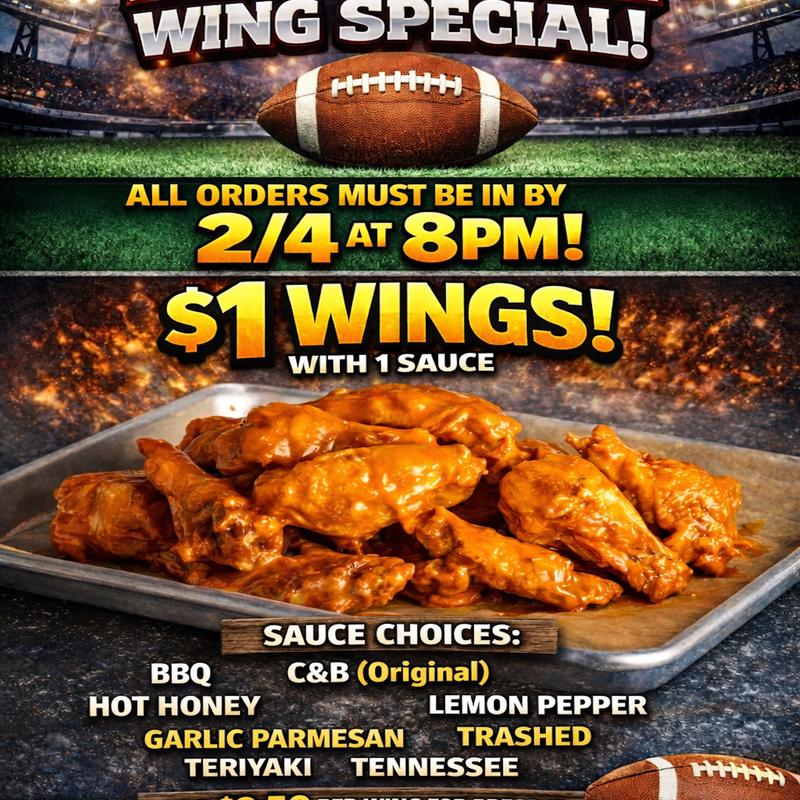 Sauce choices: BBQ, C&B (Original), Hot Honey, Garlic Parmesan, Lemon Pepper, Teriyaki, Tennessee.