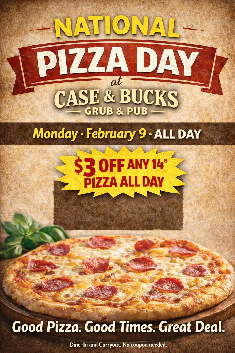 Best. Day. Ever. Join us for National Pizza Day February 9th ! $3 off 1 14" all day.